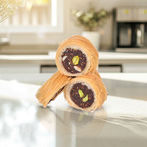 A delicious dessert made by rolling layers of flaky pastry filled with a mixture of dried figs (anjeer) and dipped in sugar syrup.